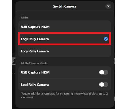 - Select "Logi Rally Camera" to switch to the in-room camera.