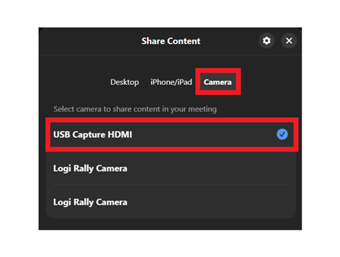 - Select "USB Capture HDMI" to share your Laptop/ Mobile Device screen.